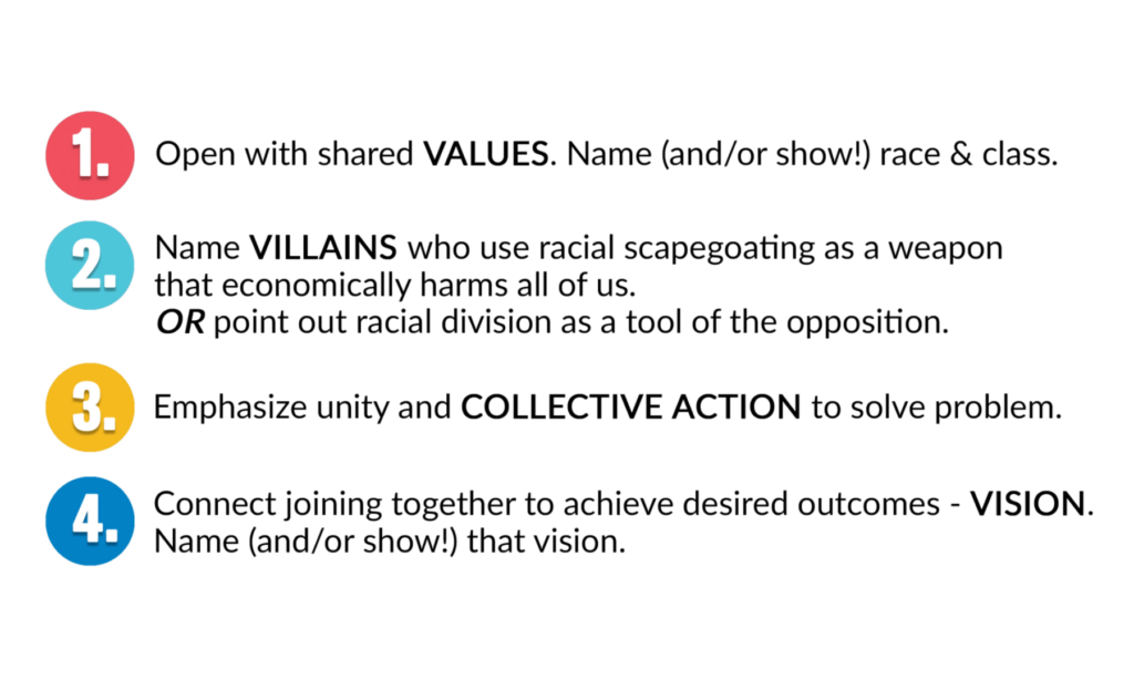 Let’s run through the four specific steps within the full Race Class Narrative framework with an example to see how we can use it to craft a compelling message.
