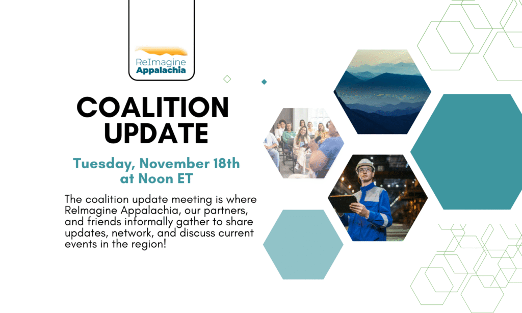 Tuesday, November 18th at noon ET via Zoom - The coalition update meeting is a fairly informal opportunity for ReImagine Appalachia to update our partners on upcoming events and hear from our partners on what they have going on. We typically hear a federal policy landscape update from National Wildlife Federation, followed by a presentation from a partner (slideshow optional) regarding a specific project they are working on, their work more generally, or something else that is relevant to leveraging federal resources. The all is representative of our coalition with an average of 50 attendees consisting of NGOs, local government officials, federal agency partners, labor leaders, grassroots volunteers, and more.