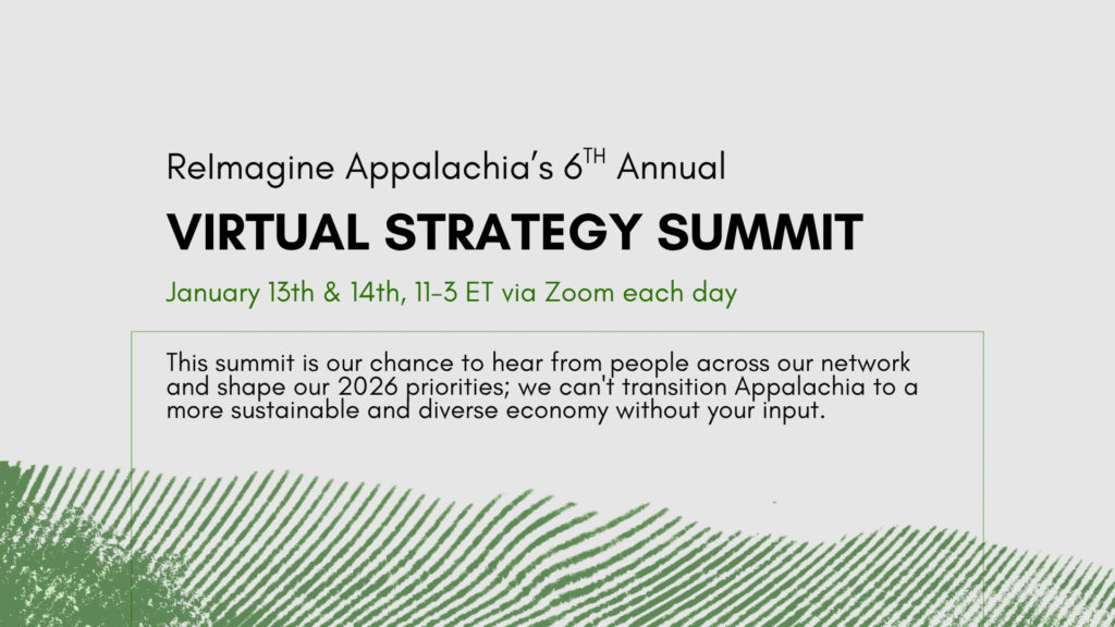 Please join us for ReImagine Appalachia’s 6th Annual Virtual Strategy Summit on January 13th & 14th, 11-3 ET each day. This summit is our chance to hear from people across our network and shape our 2026 priorities; we can't transition Appalachia to a more sustainable and diverse economy without your input. Panel and breakout session discussion topics will be released in the coming weeks. In the meantime, please save the date and reach out if you have any summit topics you’d like to ensure are addressed!