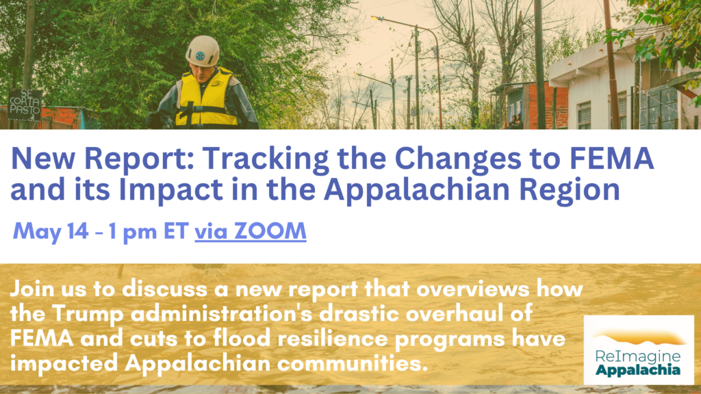 May 14, 1 PM ET via Zoom – Join us to discuss a new report that overviews how the Trump administration’s drastic overhaul of FEMA and cuts to flood resilience programs have impacted Appalachian communities. The report includes a timeline which details key administrative, legislative, and legal milestones from 2025 that catalyzed FEMA’s now precarious state in 2026. The report also finds a pattern of declining federal support consistent with our previous Federal Funding Flatline reports: FEMA investments peaked under the Biden Administration but then fell sharply after intentional cutbacks by the Trump administration.