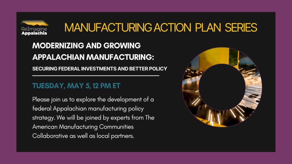 Tuesday, May 5, 2026 12:00 PM –  1:00 PM ET via Zoom – Please join us to explore the development of a federal Appalachian manufacturing policy strategy. We will be joined by experts from The American Manufacturing Communities Collaborative as well as local partners.