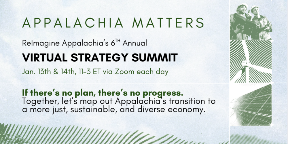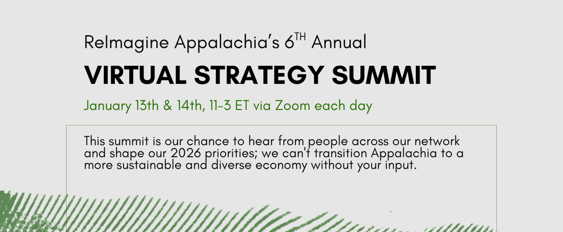 Please join us for ReImagine Appalachia’s 6th Annual Virtual Strategy Summit on January 13th & 14th, 11-3 ET each day. This summit is our chance to hear from people across our network and shape our 2026 priorities; we can’t transition Appalachia to a more sustainable and diverse economy without your input. Panel and breakout session discussion topics will be released in the coming weeks. In the meantime, please save the date and reach out if you have any summit topics you’d like to ensure are addressed!