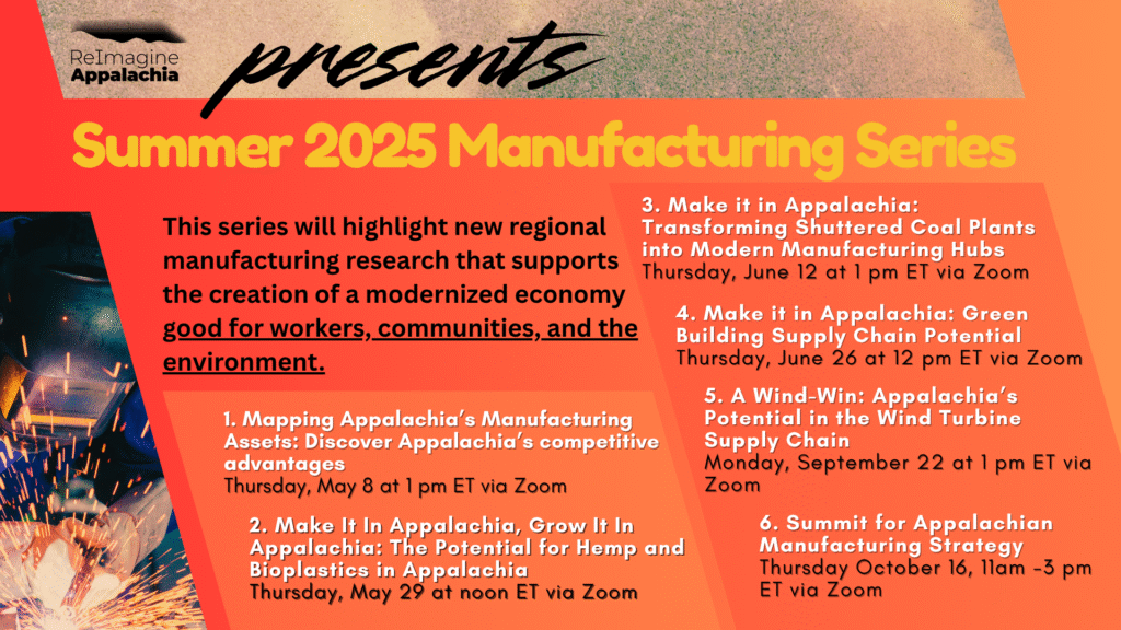 This event is part of our Summer 2025 Manufacturing Series, an ongoing series of events sharing new research on opportunities within Appalachia’s manufacturing sector, from growing feedstocks to producing final products. This series of listening sessions will explore the specific opportunities to leverage the region’s historical assets for the new energy economy and create a hub for sustainable manufacturing. Appalachians should have a say in the work to keep opportunities in the region and support the creation of a 21st century economy that’s good for workers, communities, and the environment.