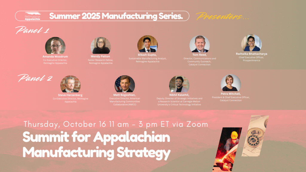 Thursday, October 16 at 11 am -3 pm ET via Zoom – The culmination of our manufacturing summer series, the Appalachian Manufacturing Action Plan Summit will be a chance to discuss the future of manufacturing in our region and the path to get there. The three hour event will include a variety of sessions to choose from on a range of topics and a larger conversation based around the creation of ReImagine Appalachia’s new Manufacturing Action Plan.